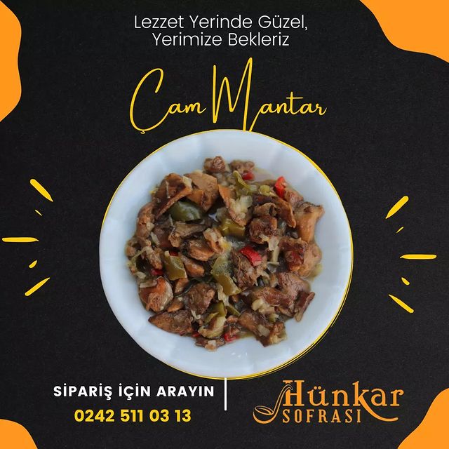 Mantar sevenlere, Et tadında Çam Mantarı. Sulu yemek çeşitlerimiz, Pide - Izgara - Lahmacun çeşitlerimiz mevcuttur.