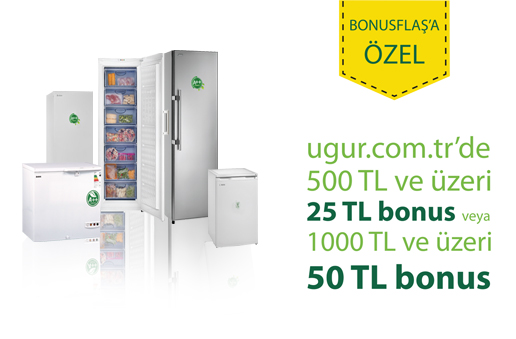 7-22 Haziran 2016 tarihleri arasında satis.ugur.com.tr adresinden yapacağınız 500 TL ve üzeri alışverişlerde 25 TL bonus veya 1000 TL ve üzeri alışverişlerde 50 TL bonus.